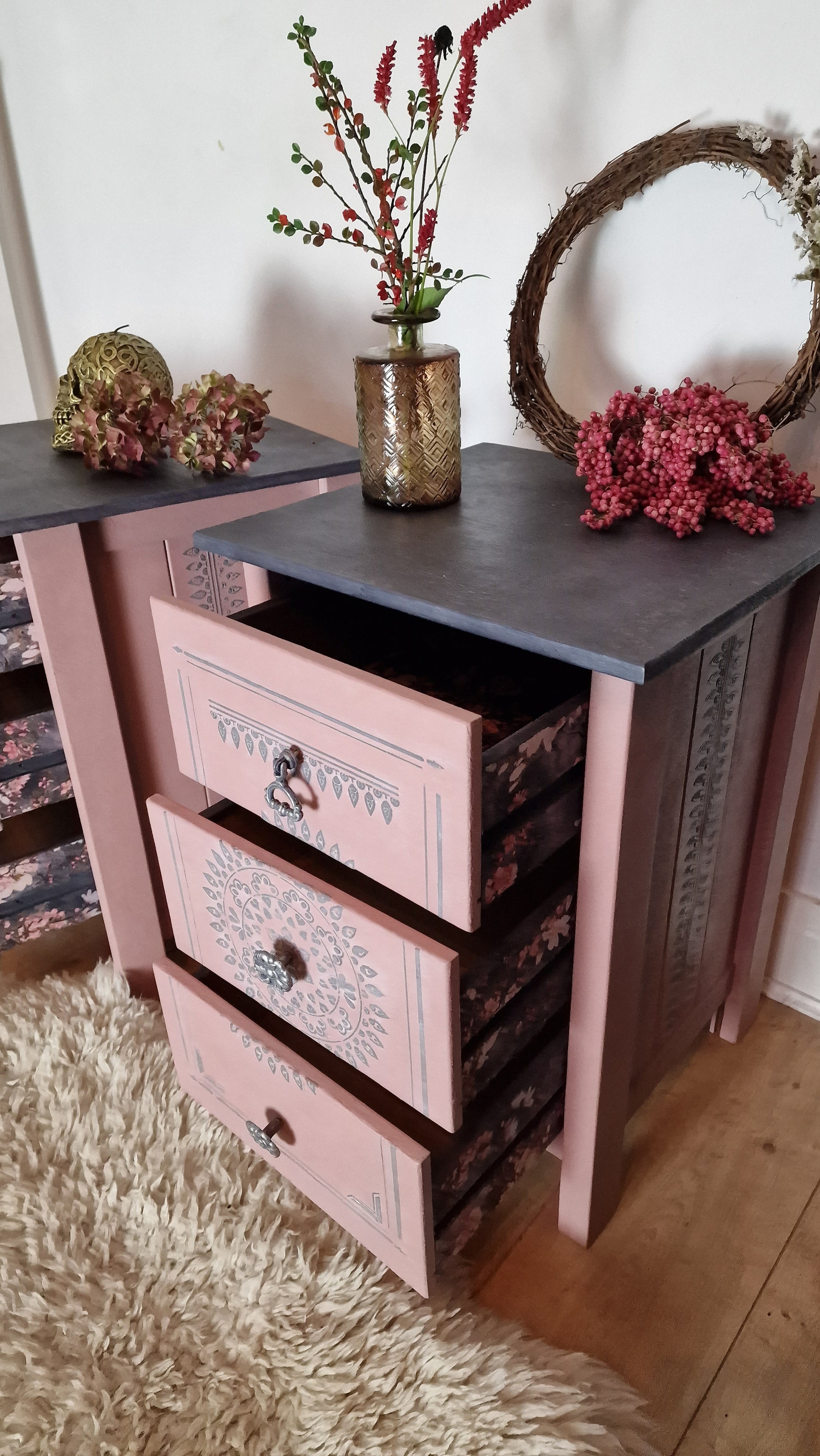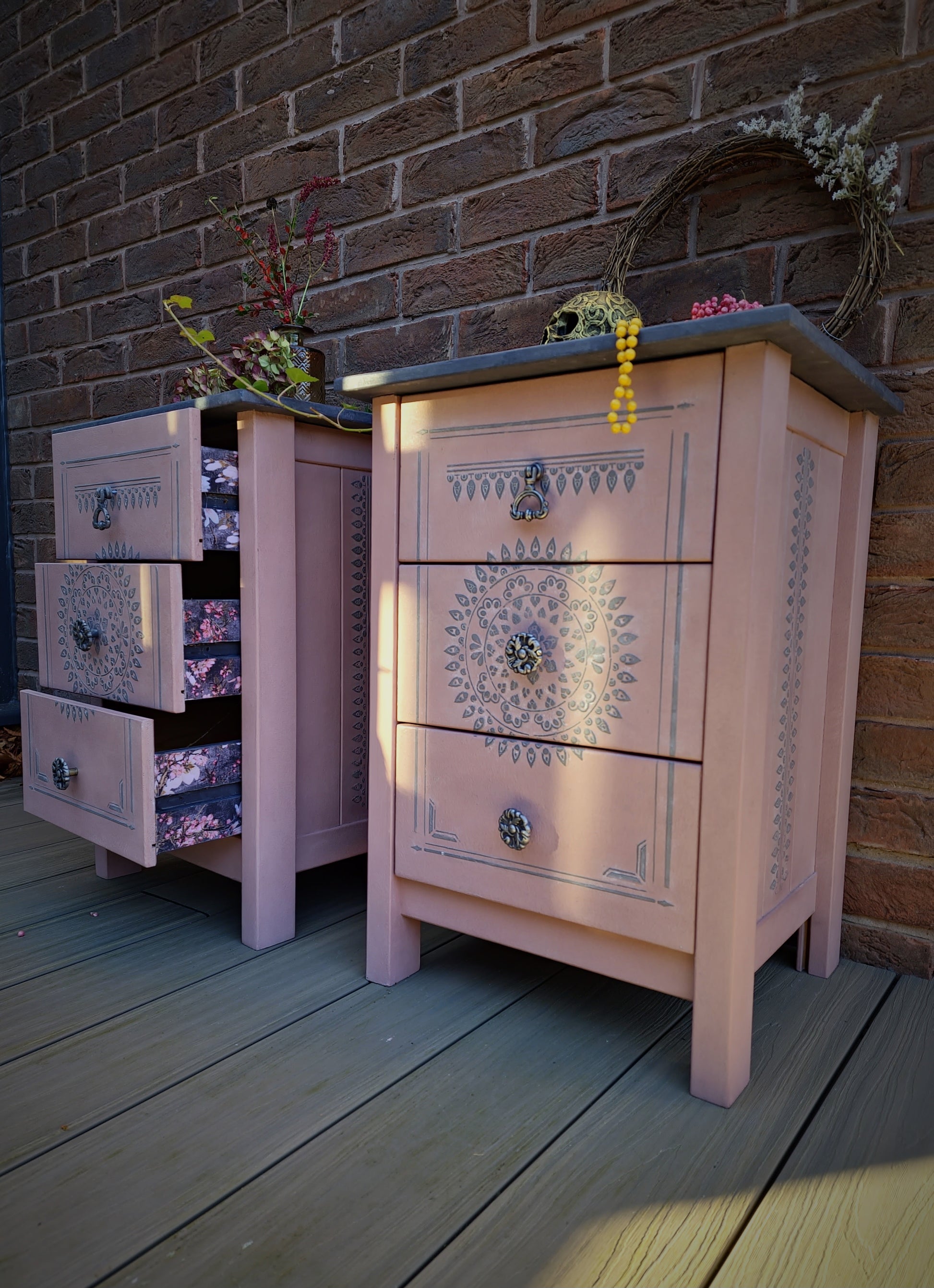 Add a touch of elegance to your bedroom with this stunning single bedside cabinet or 2 tables  available for a discounted price if bought together. These beautifully restored pine night stand feature three drawers each, painted in a stylish combination of pale , dirty pink and graphite grey. The custom mix of Annie Sloan chalk paint and salt wash gives these cabinets a unique suede-like texture, while the raised stencils and hand-painted marble effect on the tops add a touch of luxury. The drawers are lined with a beautiful black and pink floral fabric, and the dark grey pulls with silver gilding wax complete the look. These cabinet have been lovingly restored to give it a new lease on life and will make a statement in any room.